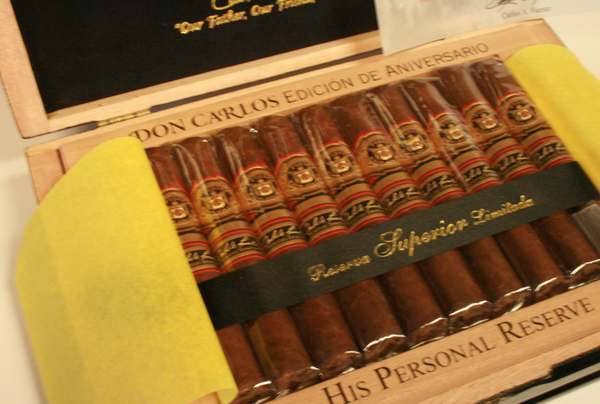Anthony’s Cigar Emporium has just received the second very limited release of Don Carlos Private Blend cigars.  Like the Eye of the Shark, the Don Carlos Personal Reserve Robusto comes in 20 ct. boxes bearing the Don Carlos Edicion de Aniversario logo and “The Man’s 80th.” The boxes are beautiful black laquered boxes that come with white Carlos Fuente Sr. smoking gloves.  The Don Carlos Personal Reserve Robusto measures 5 1/4″ x 50 and was blended by Carlos Fuente Sr. commemorating his 80th birthday and the 30th anniversary of the Arturo Fuente Don Carlos brand.