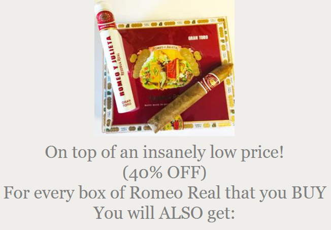 Romeo y Julieta Real 40% Off + 10 FREE Romeo Real Toro + FREE Lighter & Cutter valued at over $120 – WOW!